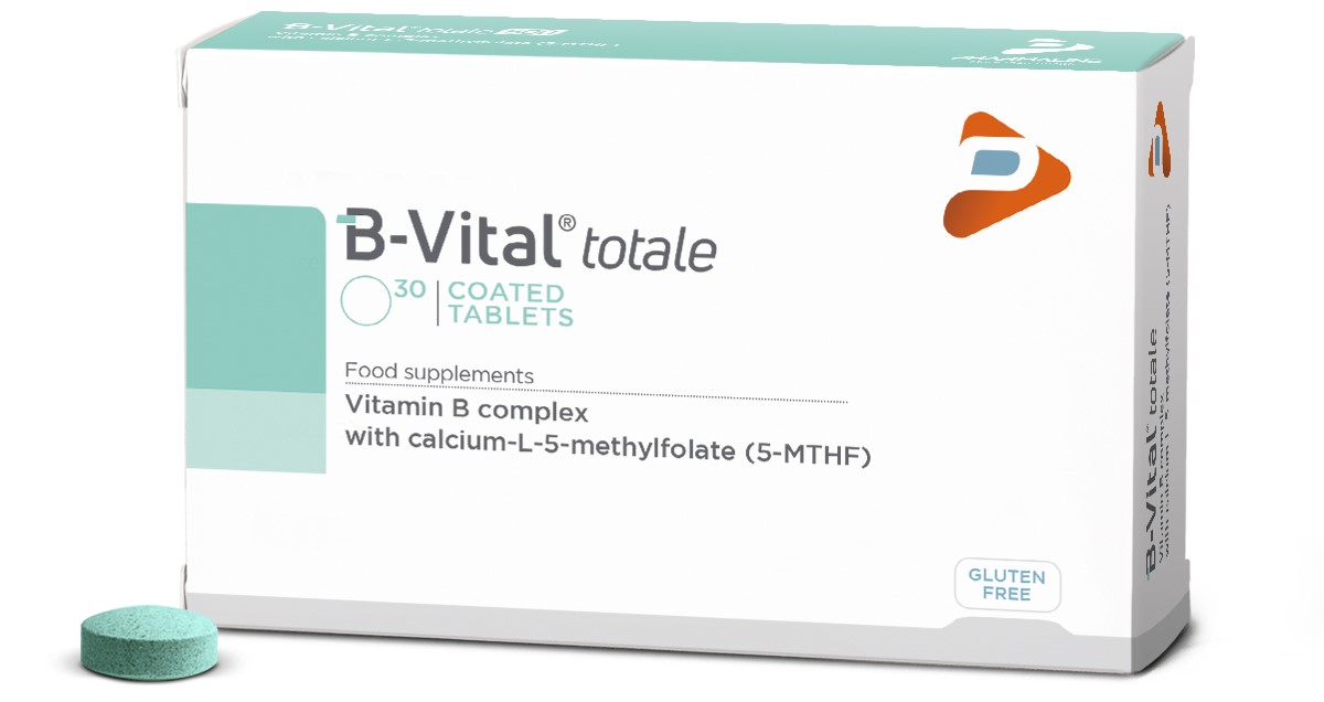 B VITAL TOTALE TABLETA X 30.Të gjitha vitaminat B dhe acidi folik, në doza të balancuara, në veçanti përmban nivelin e duhur ditor të acidit folik për gratë shtatzëna. Acidi folik kontribuon në rritjen e indeve të nënës gjatë shtatzënisë dhe në formimin rruazave të gjakut.Vitamina B 12 kontribuon në eritropoezë, ndërsa vitamina B 6 së bashku me B 12 ndikon në metabolizmin e homocisteinës. Vitamina B 1, B 2, B 6 dhe B 12 kontribuon për një metabolizëm normal energjitik. Pa gluten, laktozë.Me fruktozë dhe ëmbëlsues. Përbërja: Inositol 100 mg – Acid pantotenik 18 mg , Vitaminë B6 9.5mg-Vitaminë B2 10 mg-Vitaminë B1 10mg , Acid folik 400mcg-Vitaminë B12 25mcg.Përdorimi: Këshillohet 1 tabletë në ditë.Indikohet në reduktimin e riskut të defekteve të tubit neural gjatë shtatzënisë, në forcimin e sistemin imunitar dhe eritropoezën,kundërvepron mbi çregullimet që vijnë nga lodhja, migrena dhe stresi.