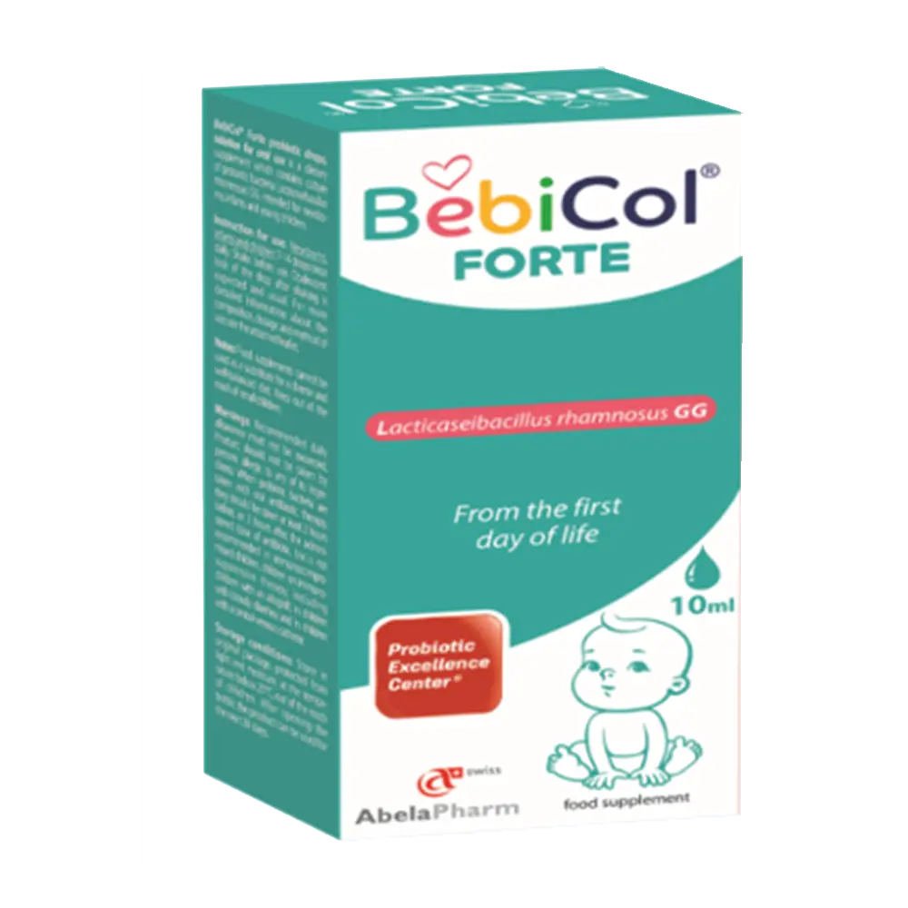Pikat BebiCol Forte përmbajnë kulturën probiotike Lactobacillus rhamnosus GG në një dozë efektive të provuar prej 10 miliardë.Probiotiku me pika BebiCol Forte rekomandohen për të sapolindurit dhe foshnjat që nga dita e parë e jetës. Mënyra e përdorimit për të sapolindurit, foshnjat dhe fëmijët: 7 pika, një herë në ditë, për dhimbje barku dhe dhimbje funksionale të barkut.14 pika, një herë në ditë, për të gjitha indikacionet e tjera (gastroenterit akut, gjatë terapisë me antibiotikë, për rikolonizimin e florës intestinale). Tundeni para përdorimit. Paketimi: 10ml