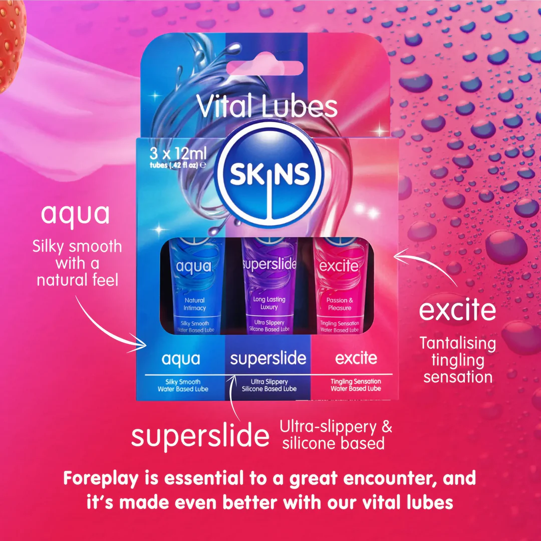 Një treshe lubrifikantësh të domosdoshem. Aqua është një lubrifikant i butë si mëndafshi me bazë uji, ideal për një ndjesi natyrale, Superslide është një lubrifikant ultra i rrëshqitshëm me bazë silikoni që funksionon edhe nën ujë, kështu që mund të përdoret si lubrifikant dushi, dhe Excite rrit kënaqësinë me një ndjesi shpimi gjilpërash joshëse.