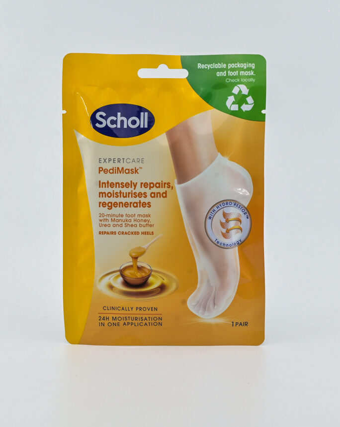 SCHOLL PEDIMASK MASKË HIDRATUESE RIGJENERUESE DHE RIPARUESE PËR KËMBËT. Përmban: mjaltë manuka, ure, gjalpë shea, ujë, glicerinë, dimetikon, gliceril stearat, etj. Përdorimi: Hiqe maskën nga ambalazhi, preje në vendin e caktuar në pjesën e sipërme të çorapes. Vishe secilën çorape në këmbë të pastra dhe të thara paraprakisht, duke e fiksuar me pjesën ngjitëse. Mbaje për 20 minuta dhe masazho këmbët për një përthithje më të mirë. Evito përdorimin në lëkurë të dëmtuar, të irrituar ose të inflamuar. Në rast irritimi, ndërprite aplikimin. Mbaje larg fëmijëve. Evito kontaktin me sytë. Ruaje në vend të freskët dhe të thatë. Mos ec me maskën pasi mund të rrëshqasësh. Paketimi: 1 Palë